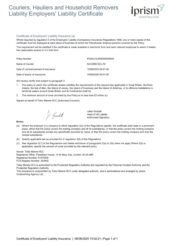 Your trust matters to us. That’s why we’re fully insured with industry-recognised policies, giving you peace of mind on every move. Click the certificates below for full details.